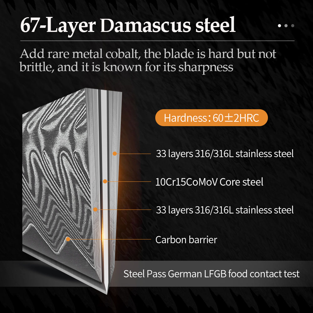 Crafted with a core of 67 Layers Damascus Super Damascus Steel, The handle fits the human body texture and provides a comfortable grip. We have achieved not only an enhanced blade hardness of 62-64HRC, but also unparalleled durability and corrosion resistance.
