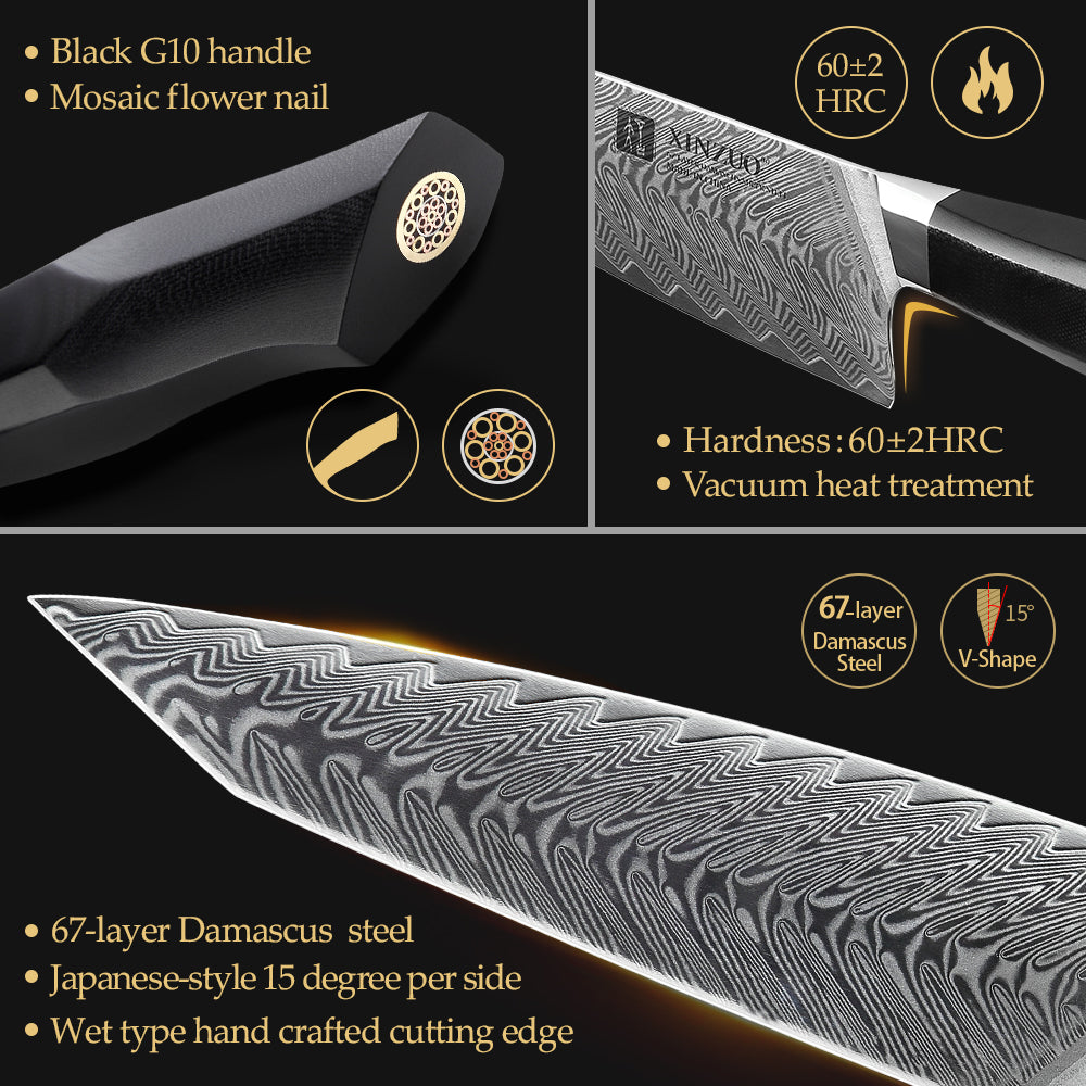 In order to make the kitchen knife have higher sharpness, toughness and rust resistance, we use 10Cr15CoMoV 67 Layers Damascus Super Steel.We always adhere to the spirit of craftsmen. Whether it is the material and process of the cutter or the design of the packaging, we have carefully done every detail and insisted on the coexistence of quality and art.