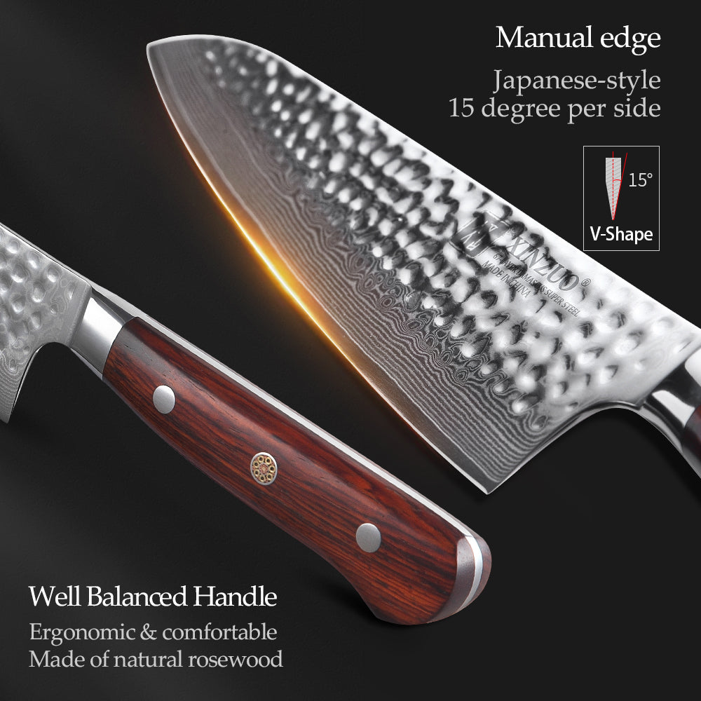 Made of 67 layers high carbon Damascus steel with 10Cr15CoMoV core under vacuum heat treatment, its hardness could reach 62HRC and offers a more durable sharp edge. It also offers a high resistance to corrosion, rust, and has a toughness equivalent to that of the rosewood & stainless steel.